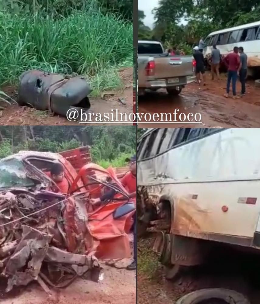 O impacto entre os dois veículos foi tão forte, que a frente da caminhonete ficou totalmente destruída.