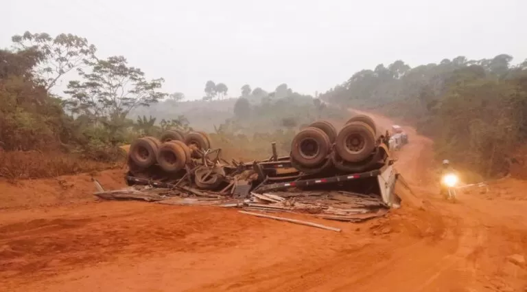 Carreta carregada de mármore tomba em ladeira na Transamazônica entre Medicilândia e Uruará