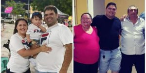 À esquerda, Vivian de Oliveira com a filha e o marido, que morreu por covid-19. À direita, a mãe, o irmão e o pai (Arquivo pessoal)[/caption]