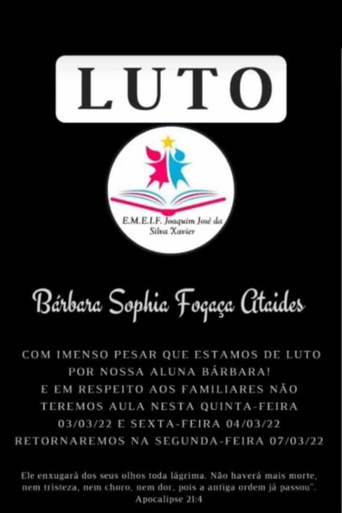 A escola Joaquim José da Silva Xavier, onde Bárbara estudava, emitiu uma nota lamentando a morte da aluna e informando que nesta quinta-feira (03) e sexta-feira (04) não haverá aula.