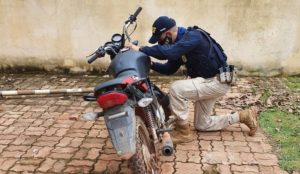 A moto foi encontrada sem placa de identificação e apresentava adulteração nos seguintes elementos de identificação veicular: supressão e remarcação do NIV, do número do motor e supressão de etiqueta. Segundo os policiais, não foi possível identificar o veículo original.