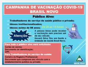 Nesta segunda-feira, 22, começou mais uma etapa de vacinação contra a covid-19, em Brasil Novo no sudoeste do Pará. A meta agora é alcançar os idosos acima de 88 anos de idade. Nesta etapa também serão vacinados trabalhadores do serviço de saúde e idosos institucionalizados.