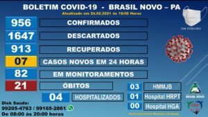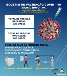 A Prefeitura municipal de Brasil Novo, através da secretaria municipal de saúde (SMS) no sudoeste do Pará, divulgou nesta quarta-feira (24), mais um Boletim Epidemiológico da Covid-19 no município, segundo a SMS, são mais 7 casos em 24 horas. Existe 82 pessoas em monitoramento e 4 pessoas hospitalizadas, 3 em um hospital do município e 1 no Hospital Regional da Transamazônica. O município recebeu 328 doses da vacina, e segundo o último boletim de vacinação, entre profissionais de saúde e idosos o município chegou a 205 pessoas vacinadas.